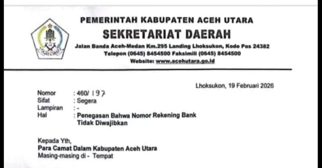 Penegasan tersebut tertuang dalam surat Sekretaris Daerah Kabupaten Aceh Utara Nomor 460/197 bersifat segera, perihal Penegasan Bahwa Nomor Rekening Bank Tidak Diwajibkan, yang ditujukan kepada seluruh camat dalam wilayah Kabupaten Aceh Utara.
