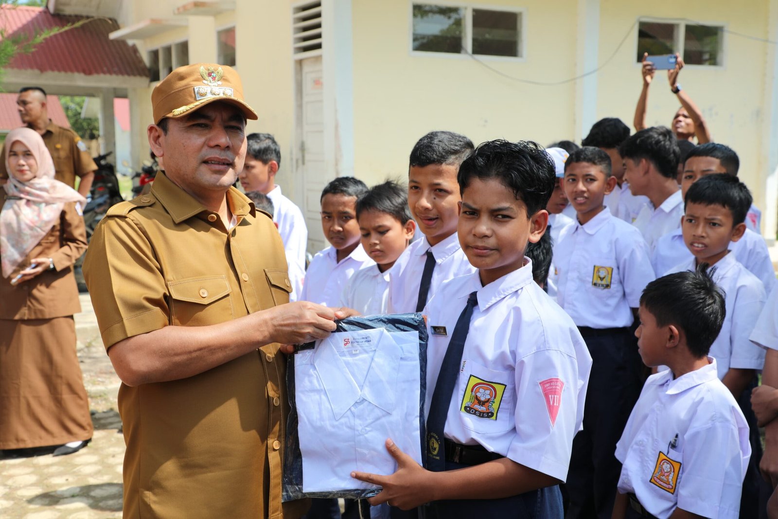 Sayuti menambahkan, pada kesempatan tersebut selain menyerahkan bantuan seragam dan alat tulis juga memberikan makanan dan minuman seperti susu dan roti untuk siswa tingkat SD maupun SMP.