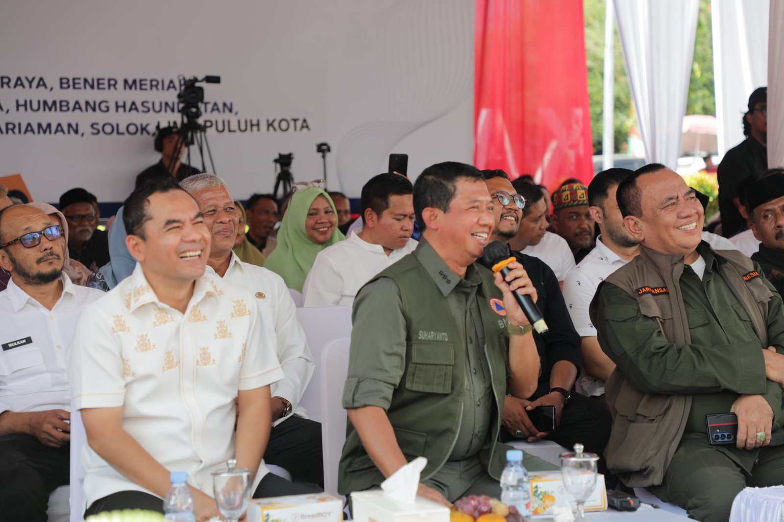 Sementara itu, Menteri Koordinator Bidang Pembangunan Manusia dan Kebudayaan turut memberikan sambutan secara daring sebagai bentuk dukungan pemerintah pusat terhadap percepatan pemulihan pascabencana.