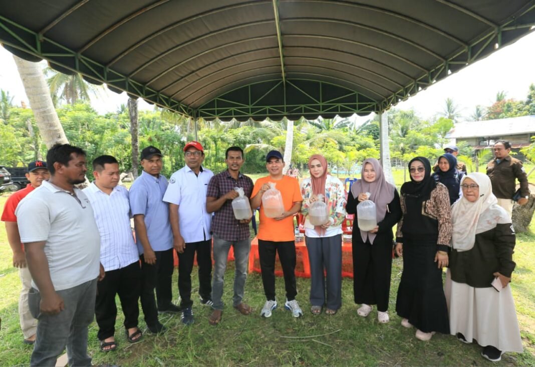 LHOKSEUMAWE, NANGGROE.MEDIA – Wali Kota Lhokseumawe, Dr. Sayuti Abubakar, SH, MH, bersama Ketua Forum Peningkatan Konsumsi Ikan (Forikan) Kota Lhokseumawe, Ny. Yulinda Sayuti, menyalurkan bantuan benur udang vaname kepada kelompok pembudidaya “Jak U Neuheun” di Gampong Tunong, Kecamatan Blang Mangat, Sabtu (25/4).