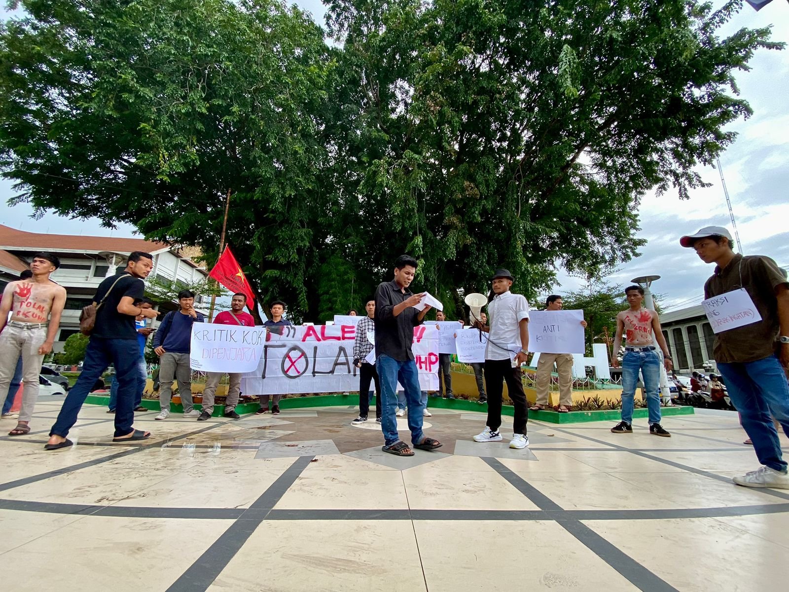 LHOKSEUMAWE | Sejumlah masa aksi tolak draf Rancangan Kitab Undang-undang Hukum Pidana (RKUHP) di Taman Riyadah Kota Lhokseumawe, pada Senin (5/12/2022).