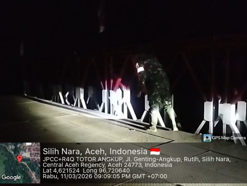NANGGROE.MEDIA, ACEH TENGAH | Kegiatan patroli jembatan dilakukan oleh anggota dari Koramil 08/Silih Nara. Kegiatan ini dilakukan pada malam Kamis, 12 Maret 2026.