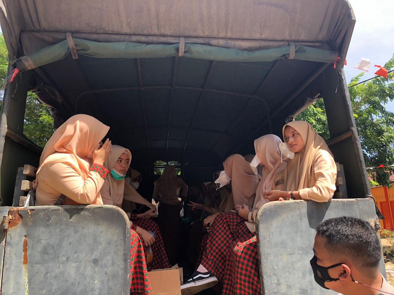 LHOKSEUMAWE Antusias ikut Vaksin, Personel Polres Lhokseumawe berikan layanan antar jemput siswa yang ikut vaksinasi dari sekolah ke Mako Polres Polres Lhokseumawe, Sabtu (9/10/2021).