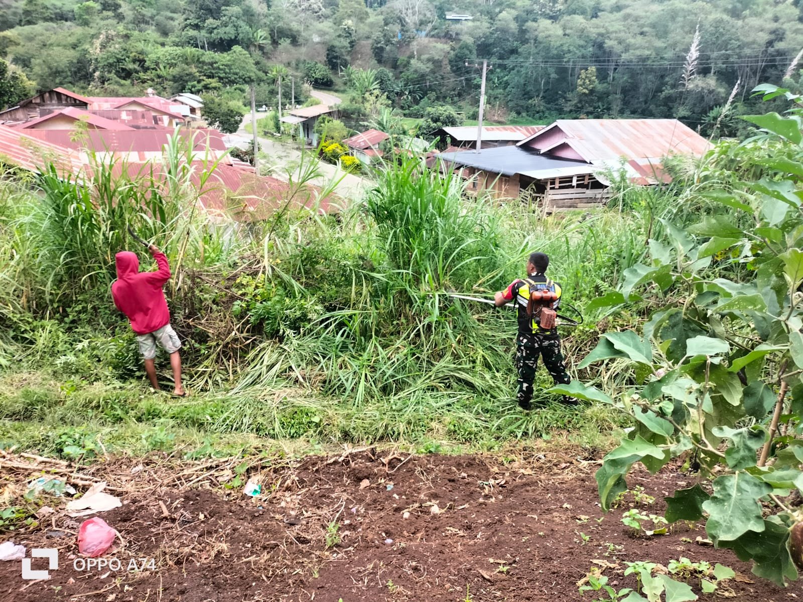 Gotong royong ini dilaksanakan tepatnya di kanan kiri jalan kebun warga yang telah ditutupi semak-semak.