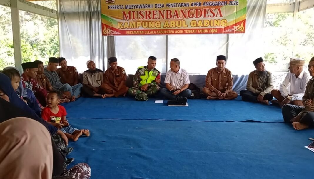 Dalam kegiatan Musrenbang tersebut turut hadir Babinsa Koramil 10/Celala, Kodim 0106/Aceh Tengah yaitu Serda Baihaki di Desa Arul Gading, Kecamatan Celala, Aceh Tengah. Jumat, 20 Maret 2026.