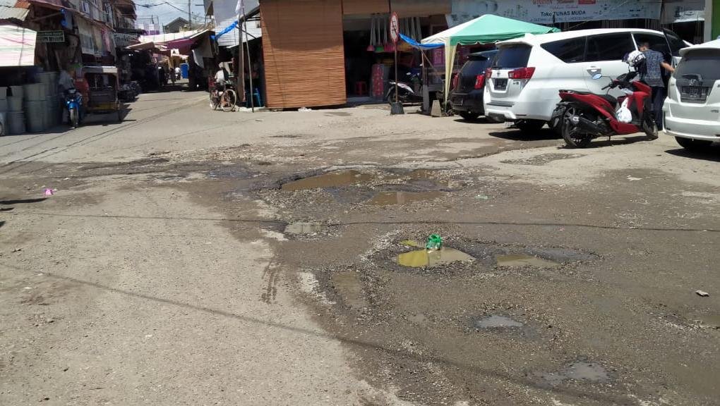 Aspal jalan tersebut berlubang dengan kedalaman 5 centimeter sehingga membahayakan bagi pengguna jalan khususnya bagi pedagang dan masyarakat yang hendak membeli kebutuhan pokok.