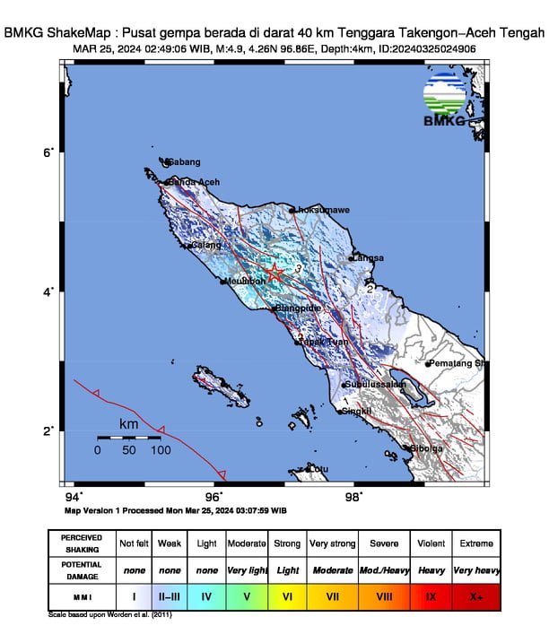 (Uptude) Mag:4.9, 25-Mar-24 02:49:06 WIB, Lok:4.26 LU, 96.86 BT (Pusat gempa berada di darat 40 km Tenggara Takengon-Aceh Tengah), Kedlmn:4 Km Dirasakan (MMI) II-III Gayo Lues #BMKG.