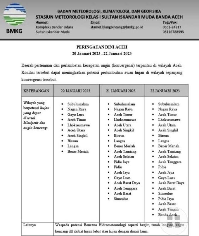 ACEH | Badan Meteorologi, Klimatologi, dan Geofisika (BMKG) memprediksi, peringatan dini seluruh wilayah Aceh memulai pada 20 – 22 Januari 2023, daerah pertemuan dan perlambatan kecepatan angin (konvergensi) terpantau di wilayah Aceh, Jumat (20/01/2023).