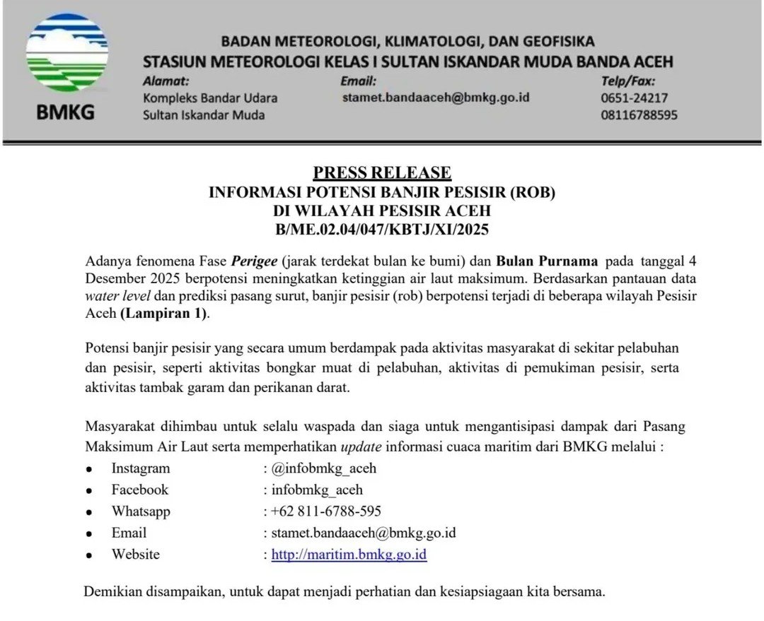 Berdasarkan hasil pemantauan data water level dan prediksi pasang surut, kondisi tersebut dapat memicu banjir pesisir di beberapa kawasan pantai di Aceh.