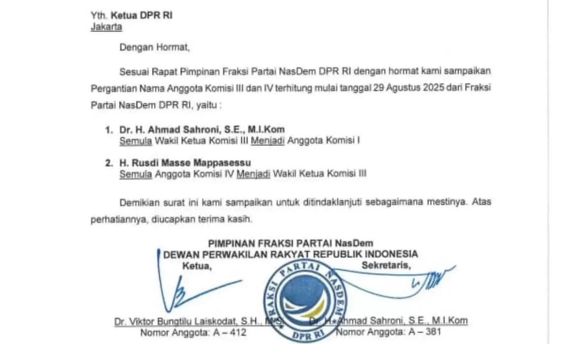 Surat tertanggal 29 Agustus 2025 tersebut ditandatangani oleh Ketua Fraksi Partai NasDem DPR RI, Victor Bungtilu Laiskodat dan Sekretaris Fraksi Partai NasDem DPR RI, Ahmad Sahroni.
