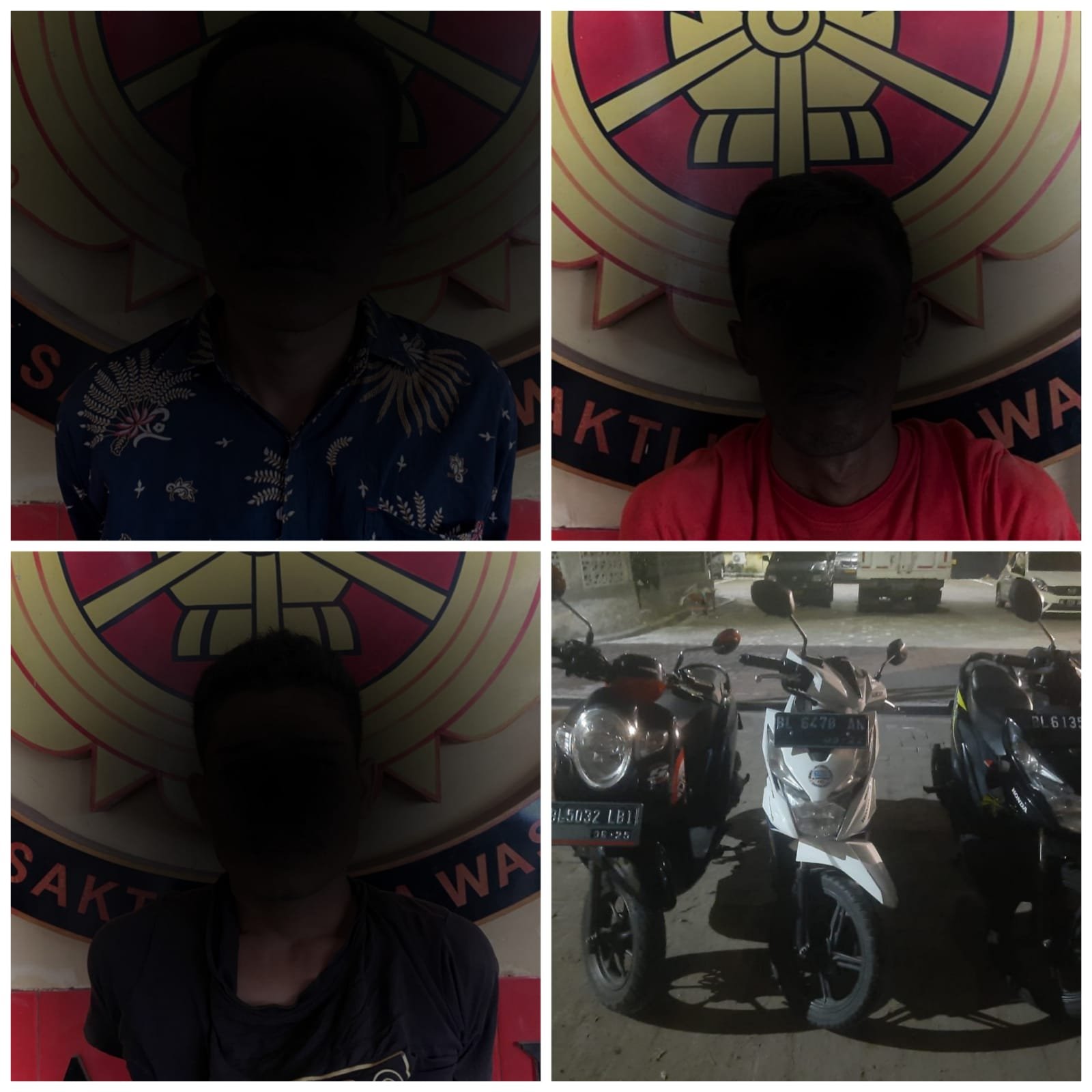 Saat dilakukan penangkapan, kami turut mengamankan tiga unit sepeda motor diantaranya, satu unit Honda Beat BL 6740 AN Warna Putih, satu unit Honda Scopy Warna Hitam Merah dan satu unit Honda Beat Warna serta kunci jenis leter T.