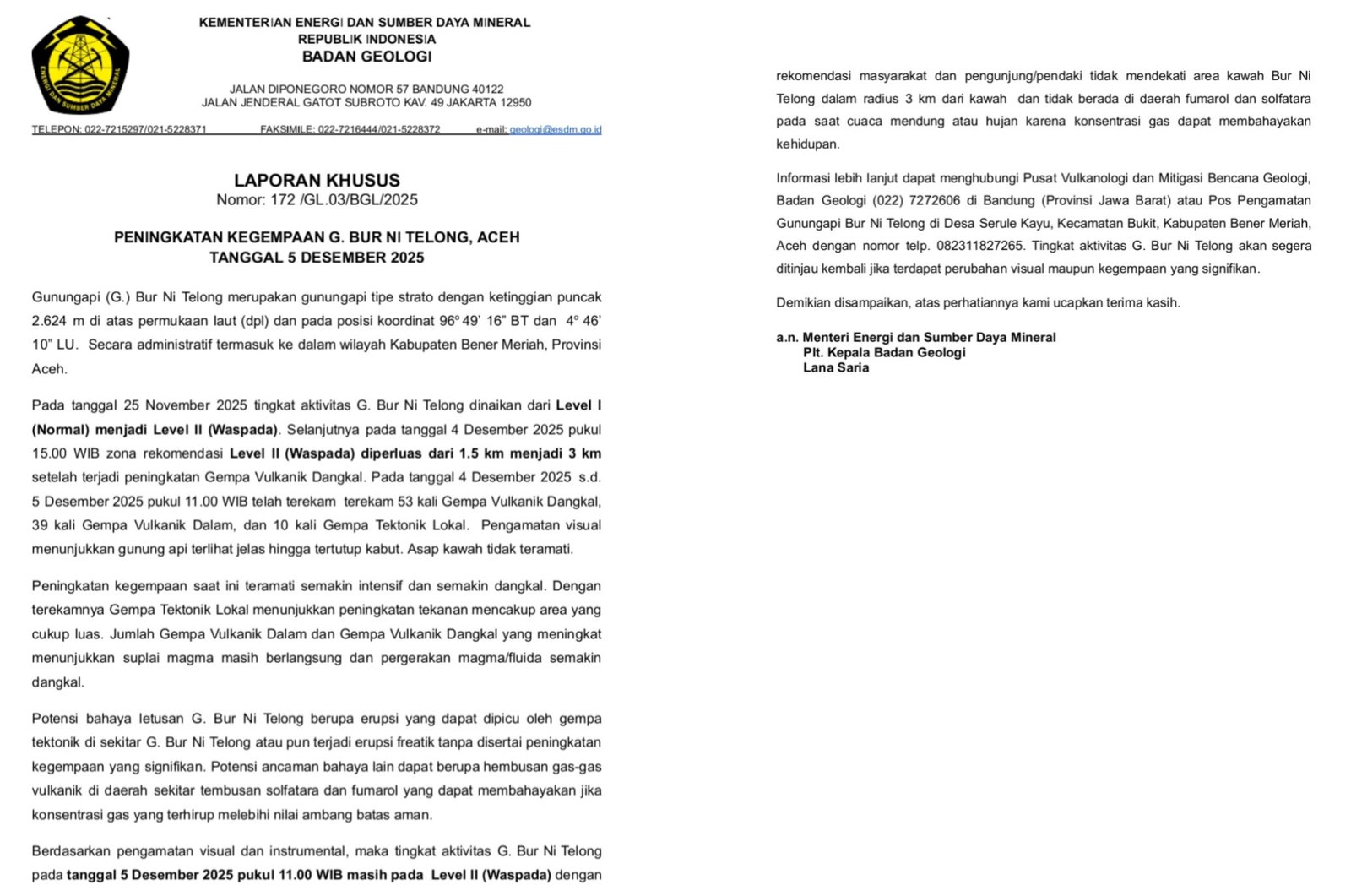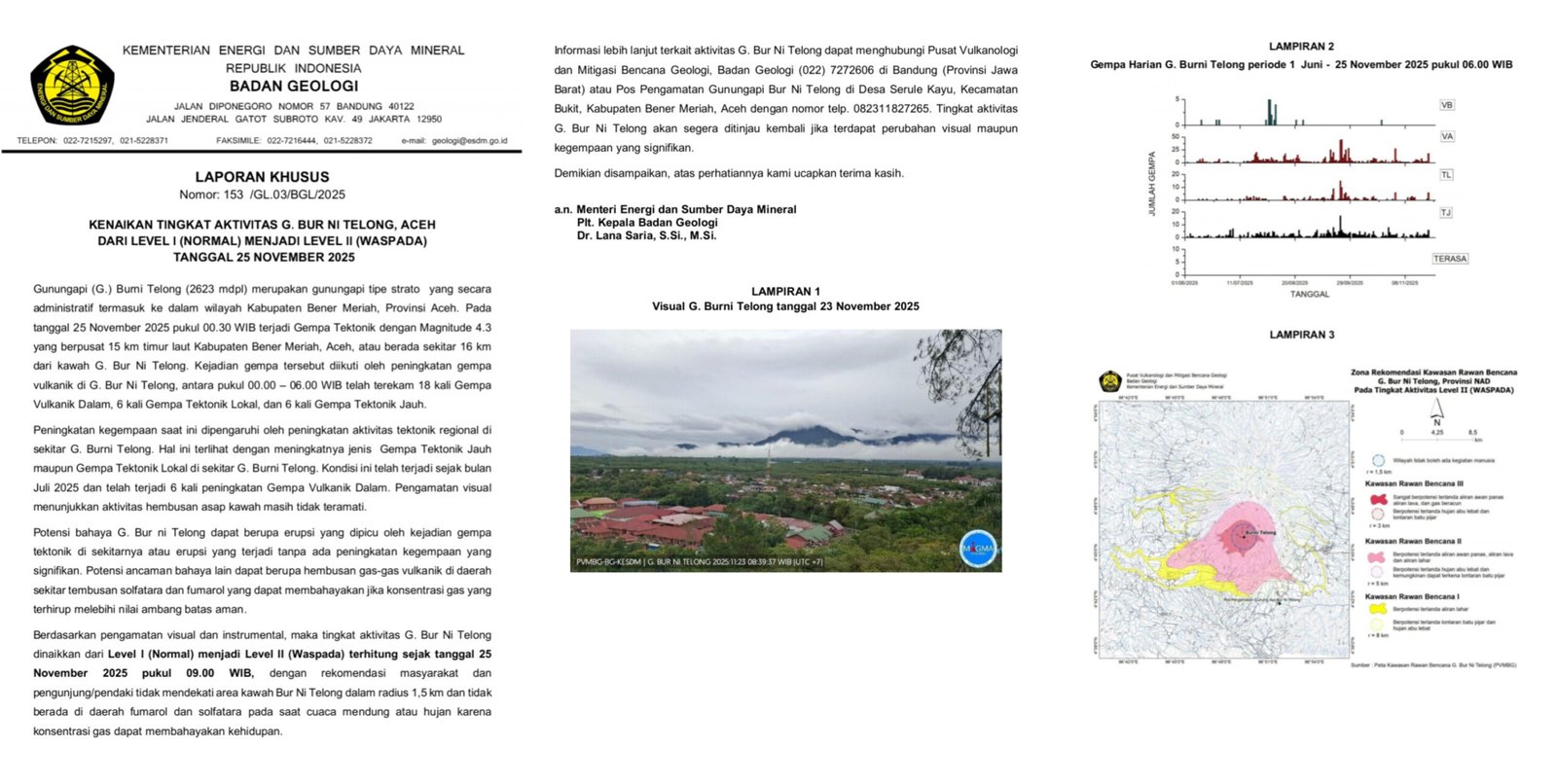 ”Kami, Badan Geologi memantau secara intensif aktivitas gunung api Burni Telong dan menginformasikan dengan segera apabila terdapat update informasi terkait aktivitas gunung Burni Telong, terimakasih,” himbaunya.