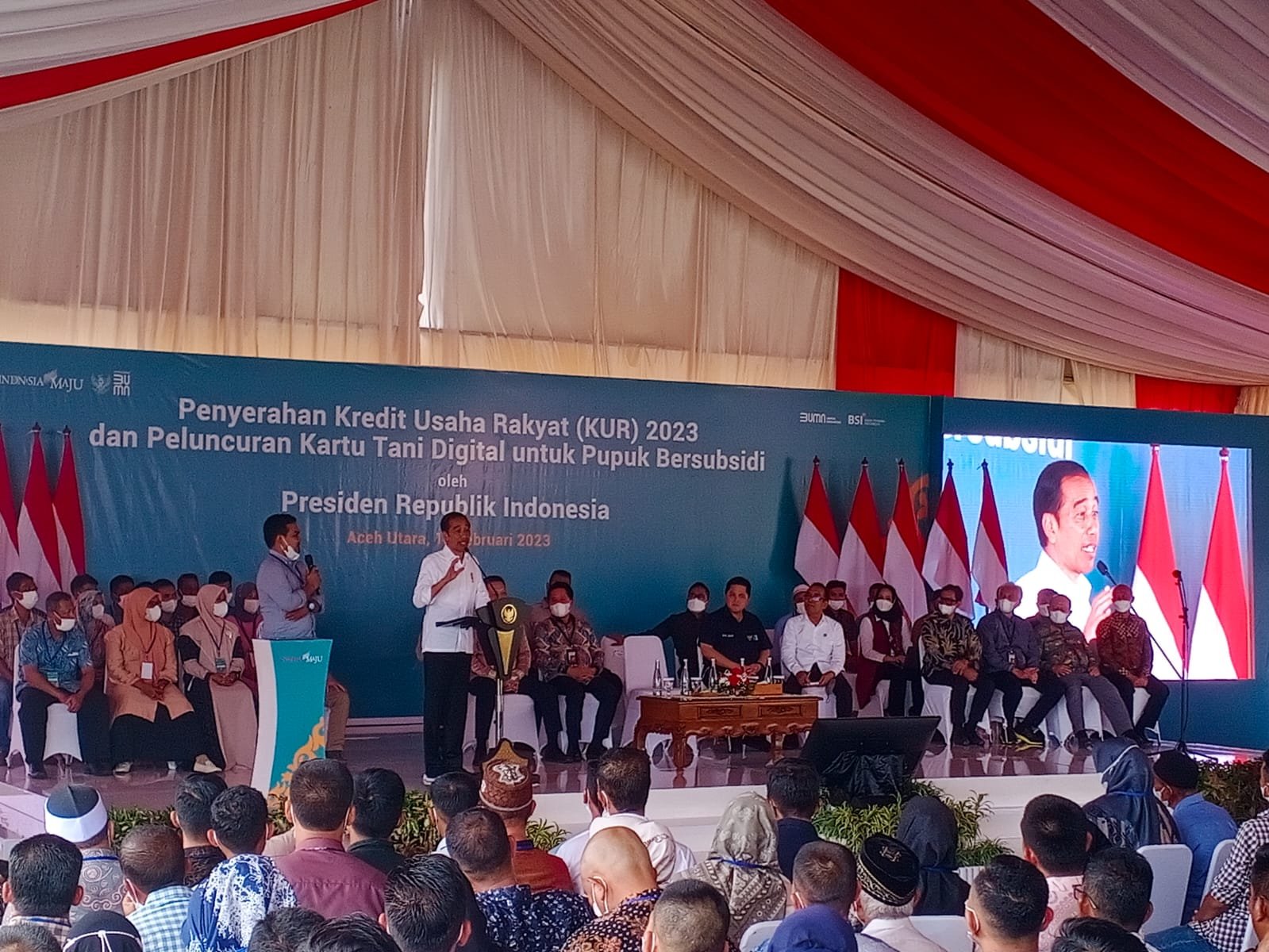 Pada Acara Penyerahan KUR dan Peluncuran Kartu Tani Digital di Lhokseumawe, Presiden didapmpingi oleh Menteri Sekretaris Negara (Mensesneg) Pratikno, Menteri Badan Usaha Milik Negara (BUMN) Erick Thohir, Pj.Gubernur Aceh, Pj. Wali Kota Lhokseumawe, dan Pj. Bupati Aceh Utara.