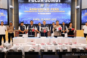 Pengungkapan ini disampaikan Direktur Reserse Siber Polda Sumut, Kombes Pol Dr. Bayu Wicaksono, dalam konferensi pers yang turut dibuka Kabid Humas Polda Sumut Kombes Pol Ferry Walintukan di Aula Tribrata Polda Sumut, Kamis (26/3/2026).