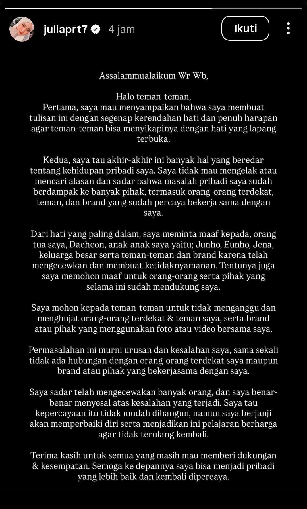 “Saya sadar telah mengecewakan banyak orang dan benar-benar menyesal atas kesalahan yang terjadi. Saya tahu kepercayaan tidak mudah dibangun, namun saya berjanji akan memperbaiki diri serta menjadikan ini pelajaran berharga agar tidak terulang kembali,” tulis Julia Prastini di story akun Instagramnya.