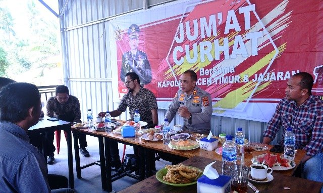 Curhat Bersama Kapolres Aceh Timur ini berlangsung di Coffee Paste, Jalan Medan-Banda Aceh, Desa Medang Ara, Kecamatan Nurussalam yang diikuti masyarakat Idi Cut (Darul Aman), Bagok (Nurussalam), Julok dan Indra Makmur, Jum’at (25/11 /2022) hal.