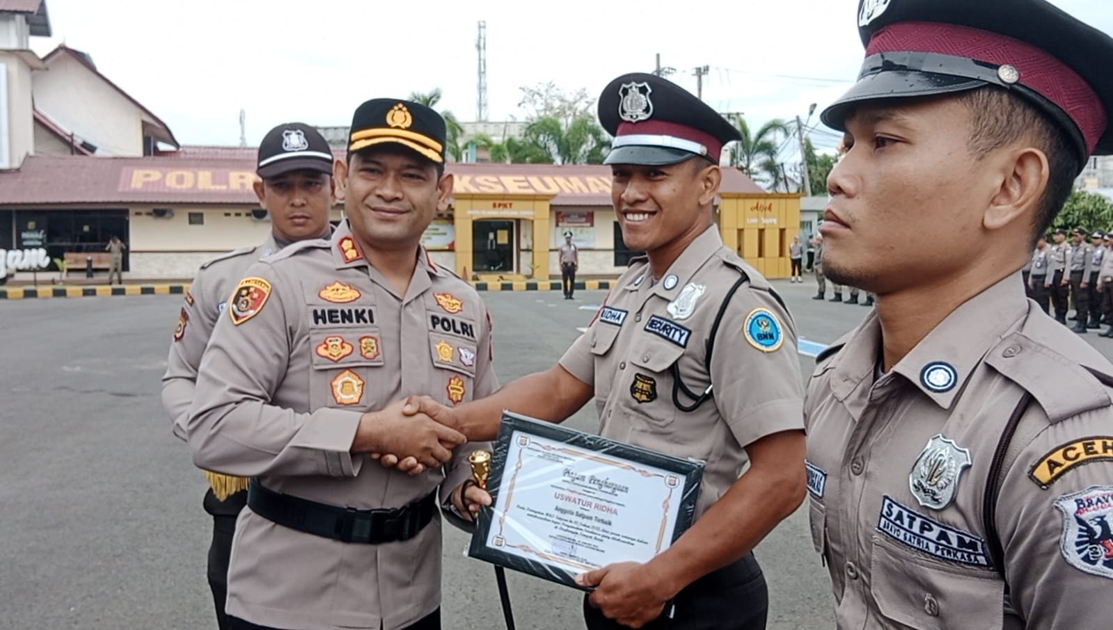 LHOKSEUMAWE | Kapolres Lhokseumawe, AKBP Henki Ismanto, SIK menyerahkan penghargaan kepada tiga personel Satuan Pengamanan (Satpam) terbaik di halaman apel Mapolres Lhokseumawe, Senin (30/1/2023) pagi.
