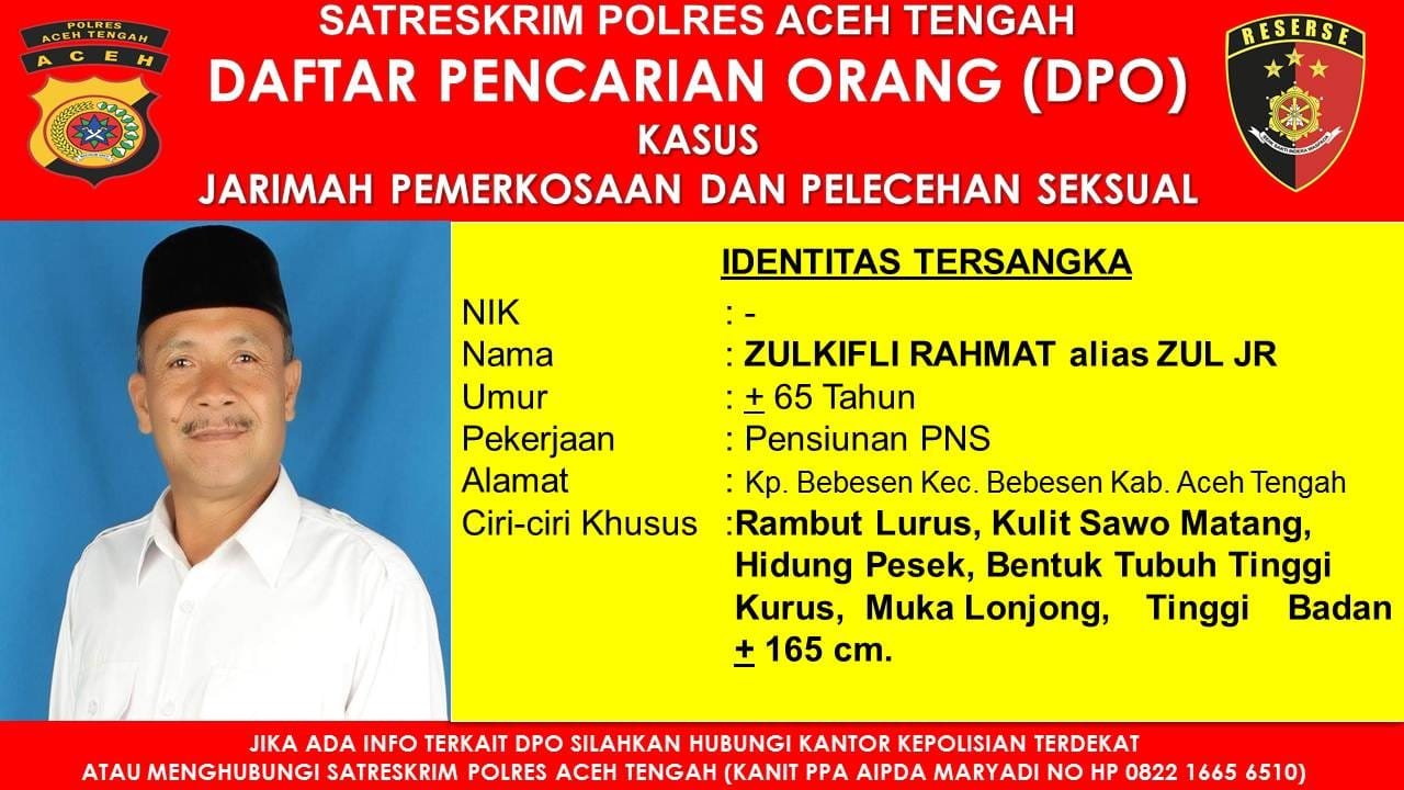 “Kita menghimbau dari Satreskrim Polres Aceh Tengah kepada masyarakat atas edaran Daftar Pencarian Orang (DPO) terhadap tersangka ZR (65), bilamana mengetahui keberadaan pelaku segera silahkan laporkan ke Polsek terdekat untuk segera kita amankan.” Tutup Kasatreskrim Polres Aceh Tengah.