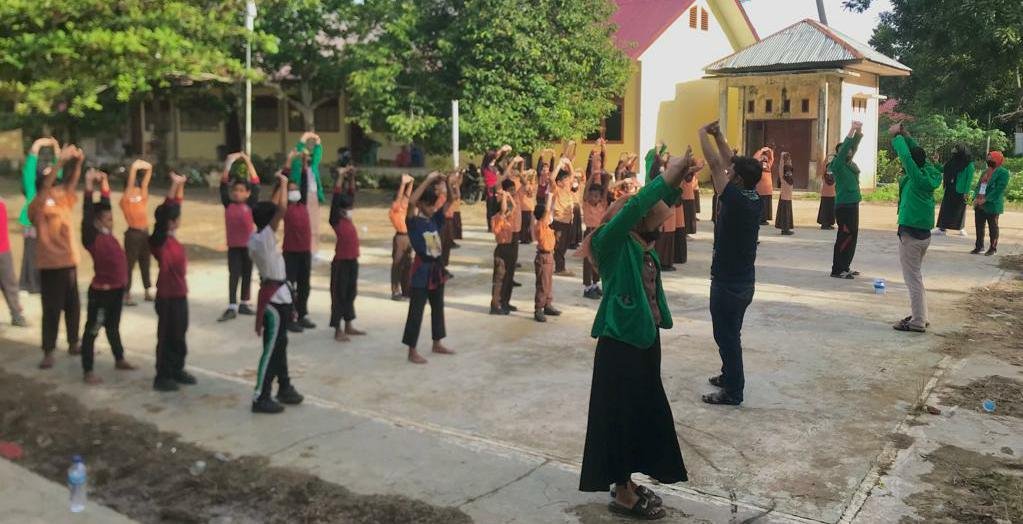 Mahasiwa/wi Universitas Malikussaleh (UNIMAL) yang sedang melakukan Kuliah Kerja Nyata Pemberdayaan Masyarakat (KKN-PPM) Kelompok 094, Sabtu (6/11/2021) mengajarkan senam yang semangat untuk siswa/wi SD N. 11 Gampong Paloh Batee, Kec. Muara Dua, Lhokseumawe.