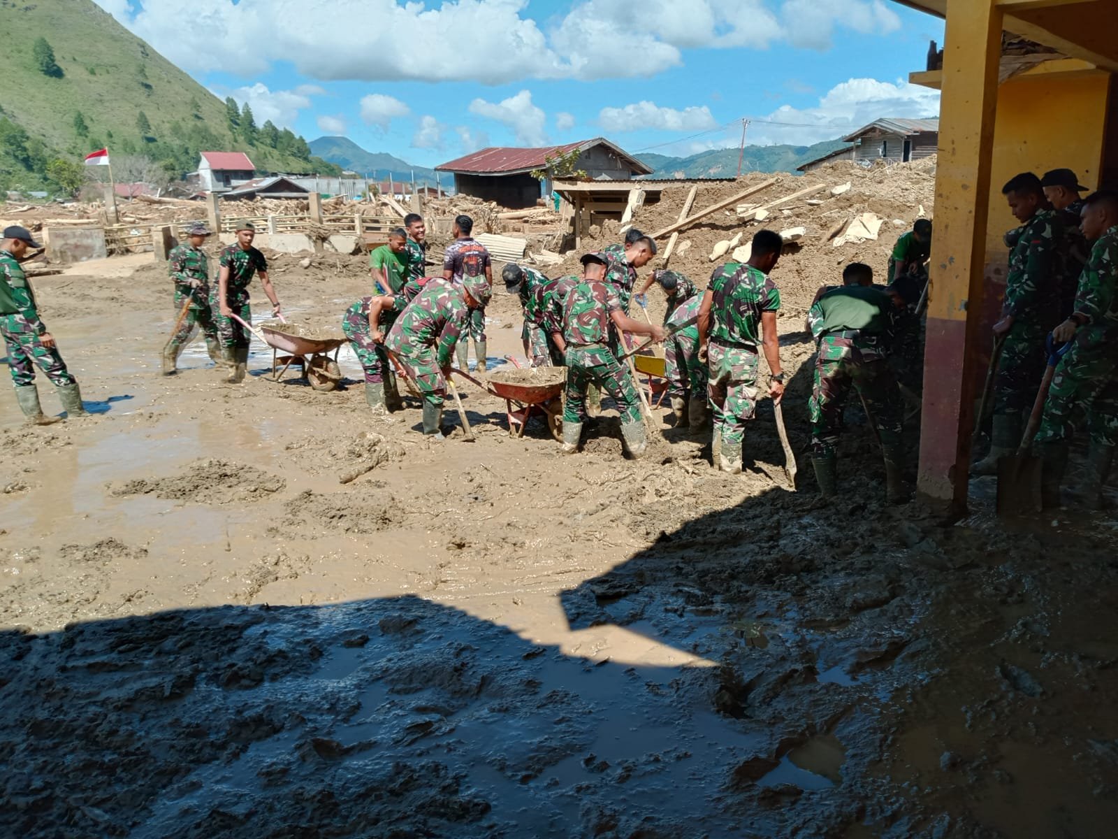 Pascabencana alam ini TNI bersama masyarakat bahu membahu dalam melakukan pembersihan agar kondisi lingkungan normal kembali.