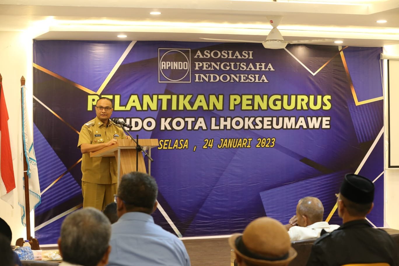 LHOKSEUMAWE | PJ Walikota Lhokseumawe menghadiri acara pelantikan Ketua Asosiasi Pengusaha Indonesia (APINDO) di Aula Wisma Kuta Karang, Selasa (24/1/2023).