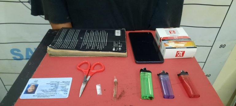 Lalu 1 kotak rokok merk Sampoerna Besar, 1 gunting dengan gagang berwarna merah, 3 mancis, 1 handphone merk Xiaomi warna hitam, dan 1 buku penyimpanan pirex.