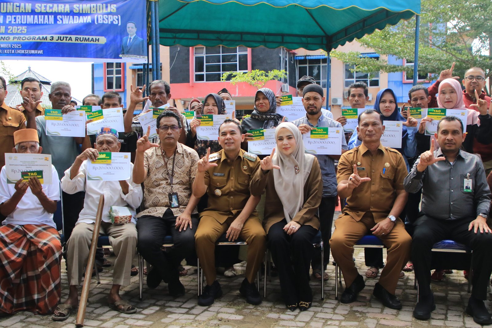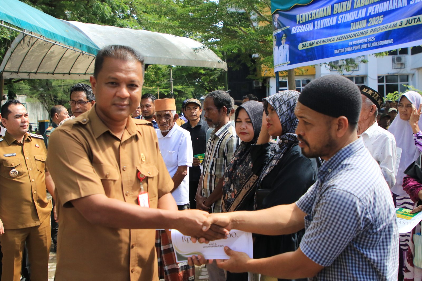 LHOKSEUMAWE, NANGGROE.MEDIA | Wali Kota Lhokseumawe Dr. Sayuti Abubakar, SH., MH menyerahkan secara simbolis buku tabungan Bantuan Stimulan Perumahan Swadaya (BSPS) kepada masyarakat penerima bantuan di halaman Kantor Dinas Pekerjaan Umum dan Perumahan Rakyat (PUPR) Kota Lhokseumawe, Selasa (4/11/2025).