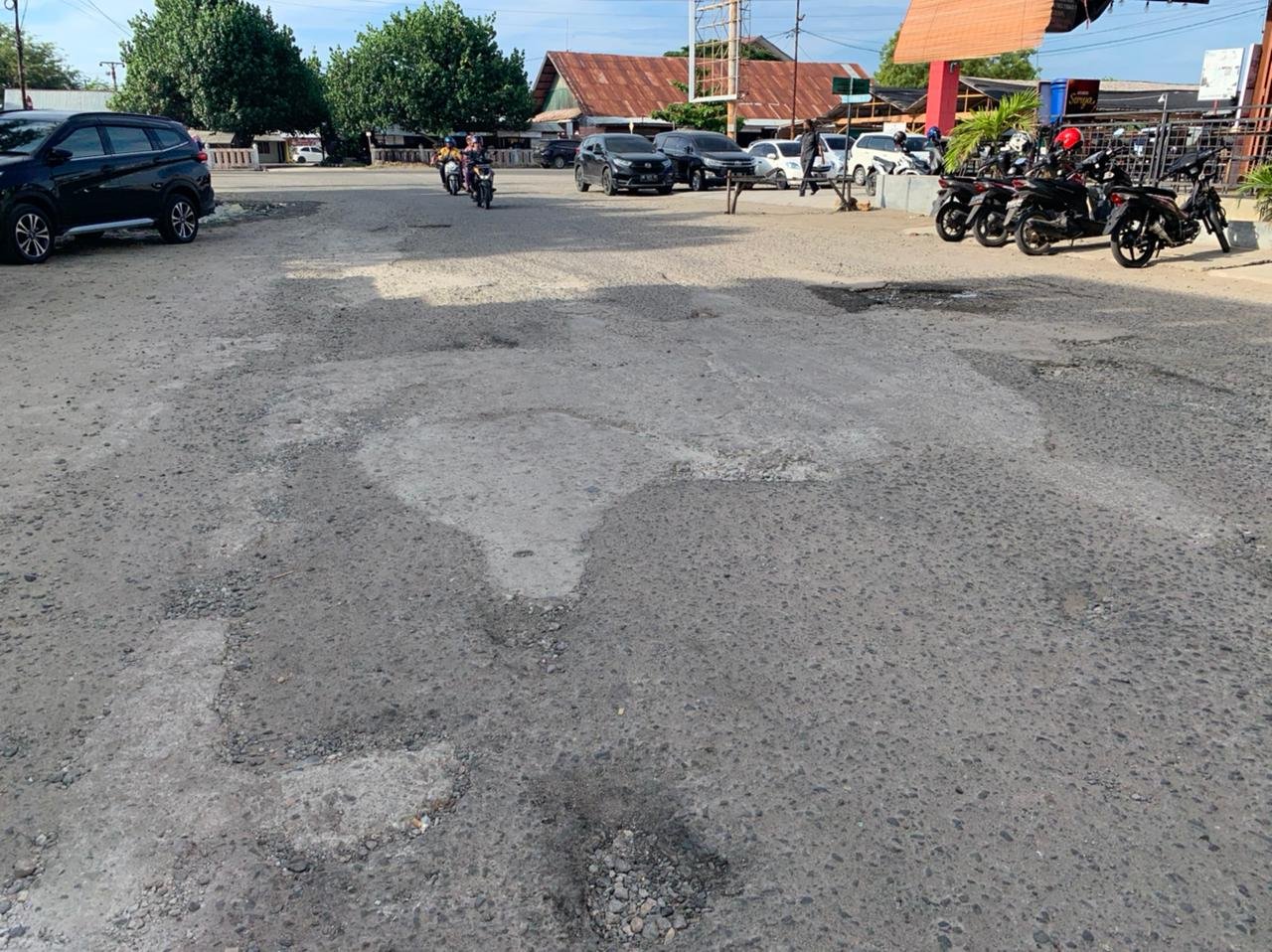 Aspal jalan tersebut berlubang dengan kedalaman 5 centimeter sehingga membahayakan bagi pengguna jalan khususnya bagi masyarakat yang hendak membeli kebutuhan pokok.